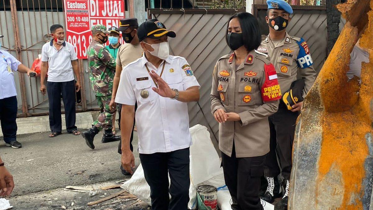 Membersihkan puing-puing di area pascakebakaran yang terjadi di Jl.Makaliwe II Gg. 3 Rt. 03/08 dan Gg 4 Rt. 04/08 Kel. Grogol Jakarta Barat, Rabu (27/10/2021).