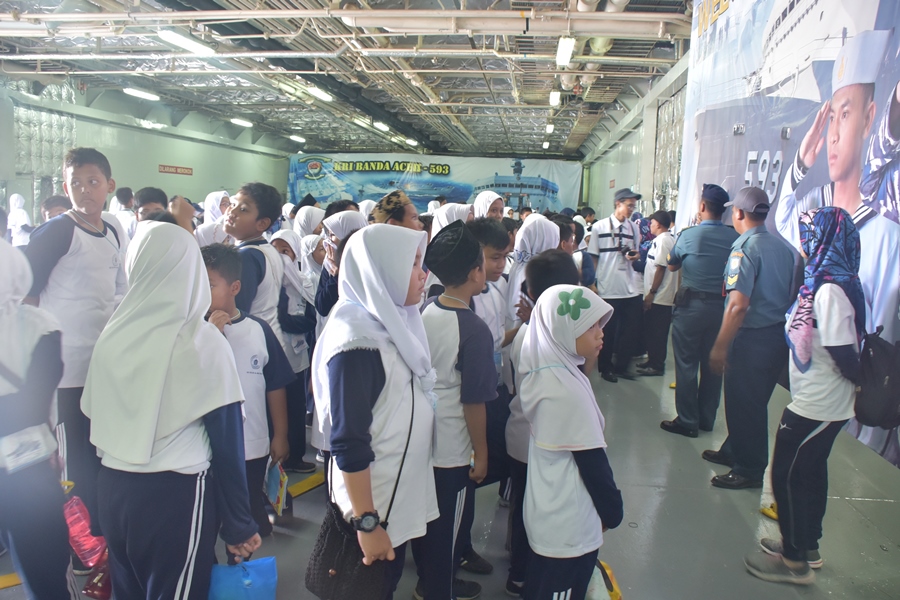 Jakarta, 13 November 2018 —–175pelajar Sekolah Dasar Islam Al Ma’ruf Cibubur berkunjung ke kapal perang Komando Lintas Laut Militer (Kolinlamil) KRI Banda Aceh 593 yang sandar di dermaga Kolinlamil, Mako Kolinlamil, Tanjung Priok, Jakarta Utara, Selasa (13/11)