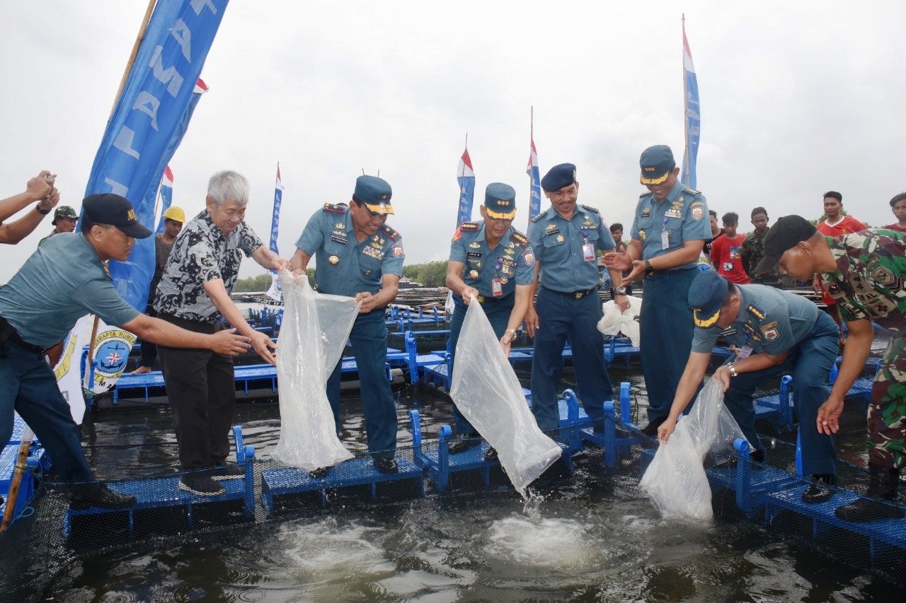 Jakarta, 19 Nopember 2018,– Dalam rangka mewujudkan program ketahanan pangan bidang maritim, serta memanfaatkan sumber daya manusia dan sumber daya alam secara optimal, Pangkalan Utama TNI Angkatan Laut I (Lantamal I) melaksanakan penebaran benih Ikan Kerapu dan Ikan Kakap di Keramba Jaring Apung (KJA) Binaan Staf Potmar (SPOTMAR) Lantamal I, Senin (19/18).