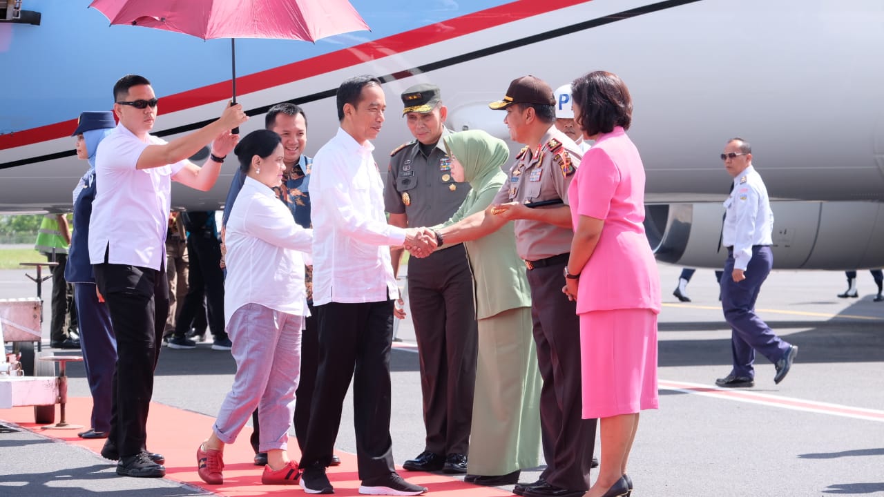 Kapolda Lampung Irjen Pol Drs Purwadi Arianto, M.Si didampingi Ketua Bhayangkari Daerah Lampung Ny. Sarie Purwadi Arianto bersama Gubernur Lampung M. Ridho Ficardo dan Pangdam II Sriwijaya Mayjen TNI Irwan, SIP, M.Hum menyambut kedatangan Presiden RI Ir. H.Joko Widodo beserta Ibu Iriana Joko Widodo tiba di Bandara Raden Inten II Lampung. Jumat ( 23/11/2018)
