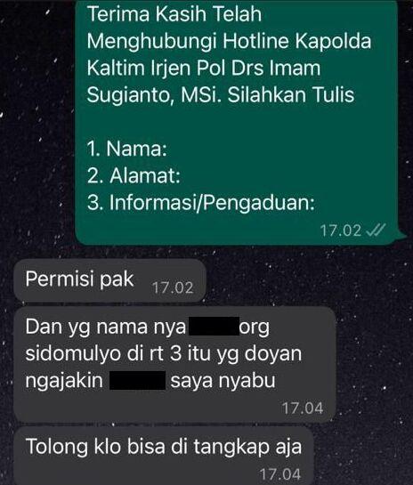 SIDIKPOST | Kukar – Seorang warga Desa Sidomulyo Kecamatan Anggana Kabupaten Kutai Kartanegara yang melapor ke nomor Hotline Kapolda Kaltim Irjen Pol Imam Sugianto, 08115421990 lantaran suaminya yang sering diajak nyabu oleh seseorang berinisial SR.