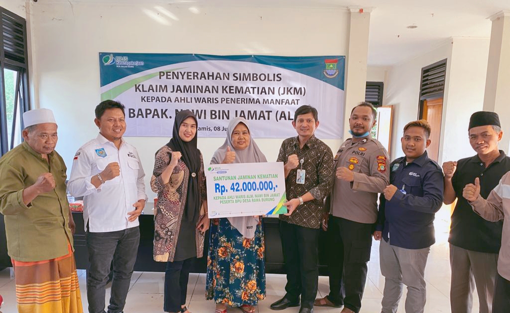 Edi Bawono Kepala Cabang Pasar Kemis Kabupaten Tangerang ,” Menyampaikan Bahwa Pemberian santunan tersebut adalah kepedulian negara dalam memberikan perlindungan kepada tenaga kerja melalui program BPJS Ketenagakerjaan Cabang Pasar Kemis. Penyerahan Simbolis Kepada Ahli Waris Penerima Manfaat Alm. Nawi Bin Jamat Peserta BPU Desa Rawa Burung. Semoga Bantuan sebesar Rp 42.000.000,- Dapat sangat bermanfaat untuk keluarga yang di tinggalkan dan bisa di manfaatkan untuk kebutuhan yang lain, sesuai dengan kebutuhan keluarga dan tentunya kebutuhan yang berkaitan dengan almarhum “.