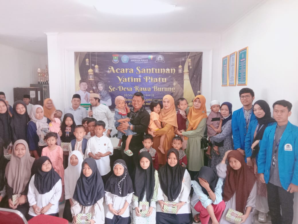 Ahmad Damhuri Boyo Kepala Desa Rawa Burung Menyampaikan ,” Assalamualaikum Warahmatullahi Wabatokatuh ,” Alhamdulillah Puji Syukur Kepada Allah SWT. Pelaksanaan kegiatan Acara Santunan Anak Yatim Se-Desa Rawa Burung 10 Muharram 1444 H (Menebar Kebaikan Antar Sesama Di Bulan Yang Mulia). “Dalam Rangka Indahnya Berbagi Dengan Bersedekah dan Saling Berbagi kepada Anak Yatim Piatu “. Sebagai bentuk kepedulian kami Pemerintah Desa Rawa Burung Bersama AP II Bandara Soekarno-Hatta terhadap Anak Yatim-piatu “.