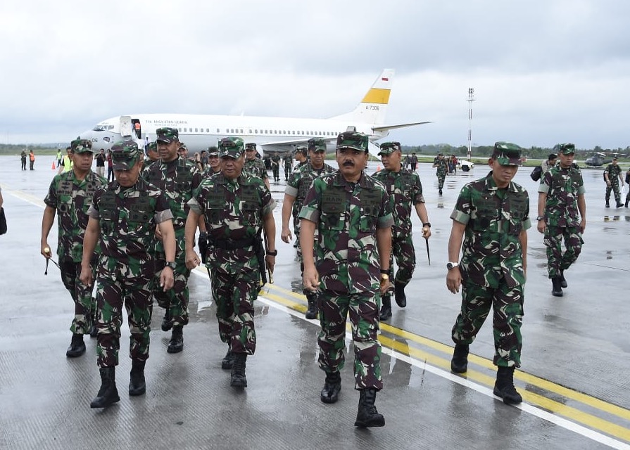 Dengan menggunakan Pesawat Boeing 737-400 Nomor Seri A-7306 TNI AU dari Lanud Halim Perdanakusuma Jakarta Timur, Panglima TNI Marsekal TNI Hadi Tjahjanto beserta rombongan tiba di Bandara Blimbingsari, Kabupaten Banyuwangi, Jawa Timur, Selasa (27/11/2018).