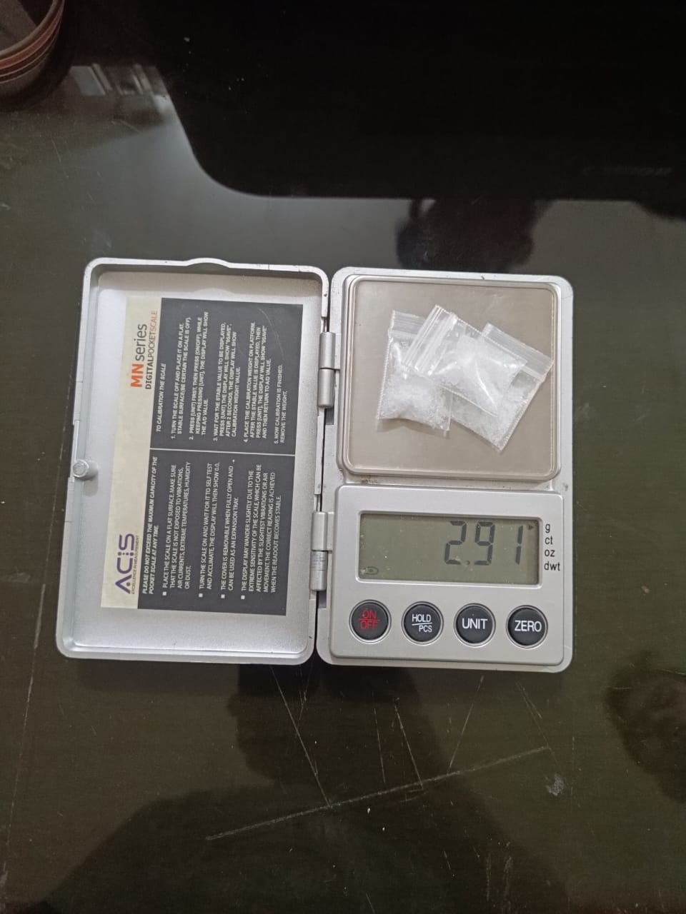 Barang bukti yang diamankan di antaranya tiga bungkus plastik bening berisi kristal putih yang diduga narkotika jenis sabu-sabu dengan berat bruto 2,91 gram, satu sendok takar plastik warna bening, satu sendok takar plastik warna biru, serta satu unit handphone Samsung warna biru.
