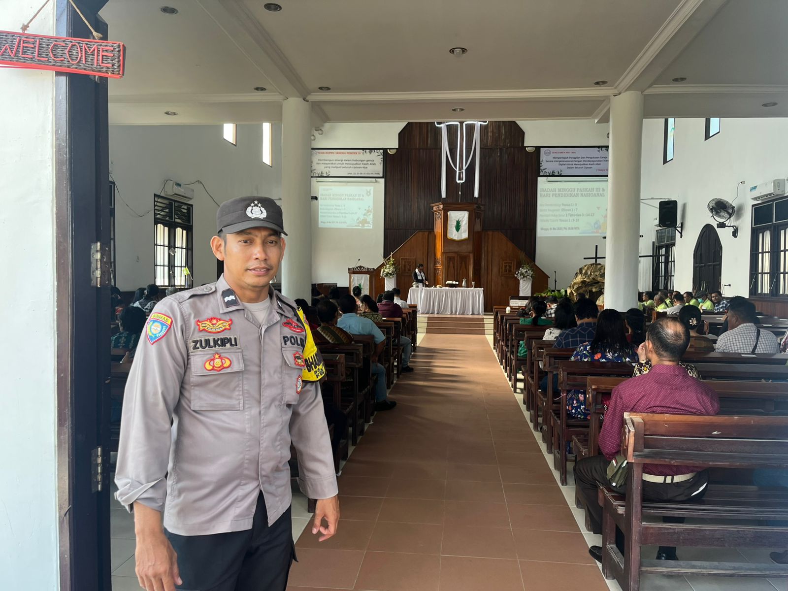Selain memastikan ibadah berlangsung lancar dan aman, AIPDA Zulkipli juga menyampaikan pesan kamtibmas kepada para jemaat, agar tetap menjaga kewaspadaan serta menjalin hubungan baik antara warga dan aparat. Ia mengajak seluruh masyarakat untuk aktif berbagi informasi demi keamanan bersama.