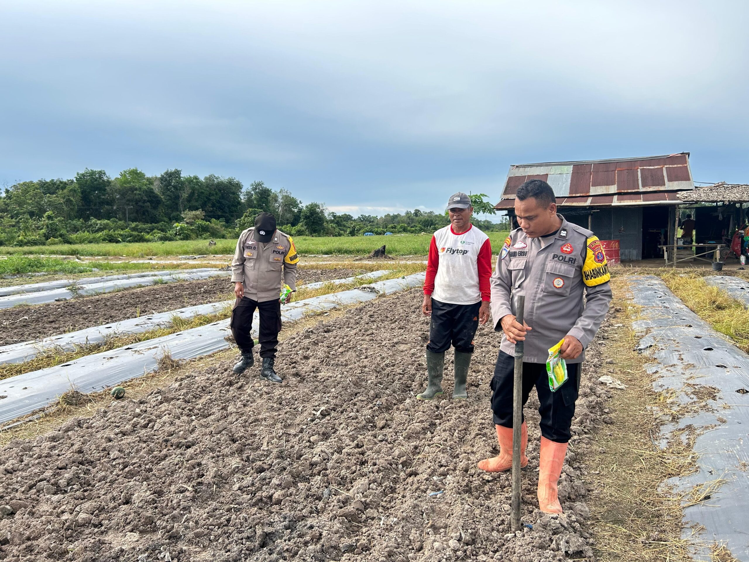 Personel Polsek Anggana turun langsung mendampingi warga membuka lahan dan melakukan penanaman jagung, Rabu (21/5/2025).
