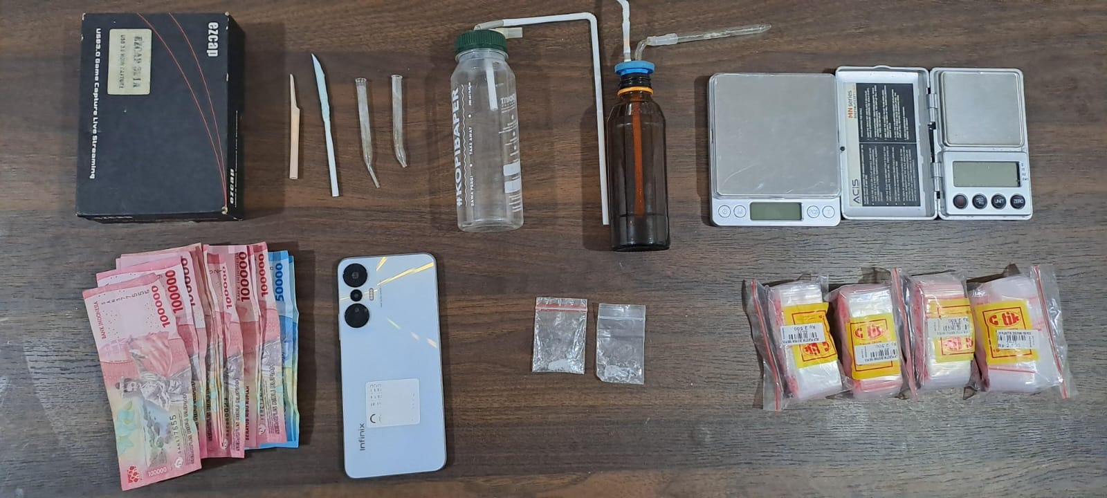 Penangkapan dilakukan di sebuah kontrakan di Jalan Drs. HB. Suparno, Kelurahan Rawa Makmur, Kecamatan Palaran. Dari lokasi, petugas menyita dua bungkus sabu seberat 1,74 gram, timbangan digital, alat hisap, plastik klip, dan uang tunai Rp1,5 juta yang diduga hasil transaksi.