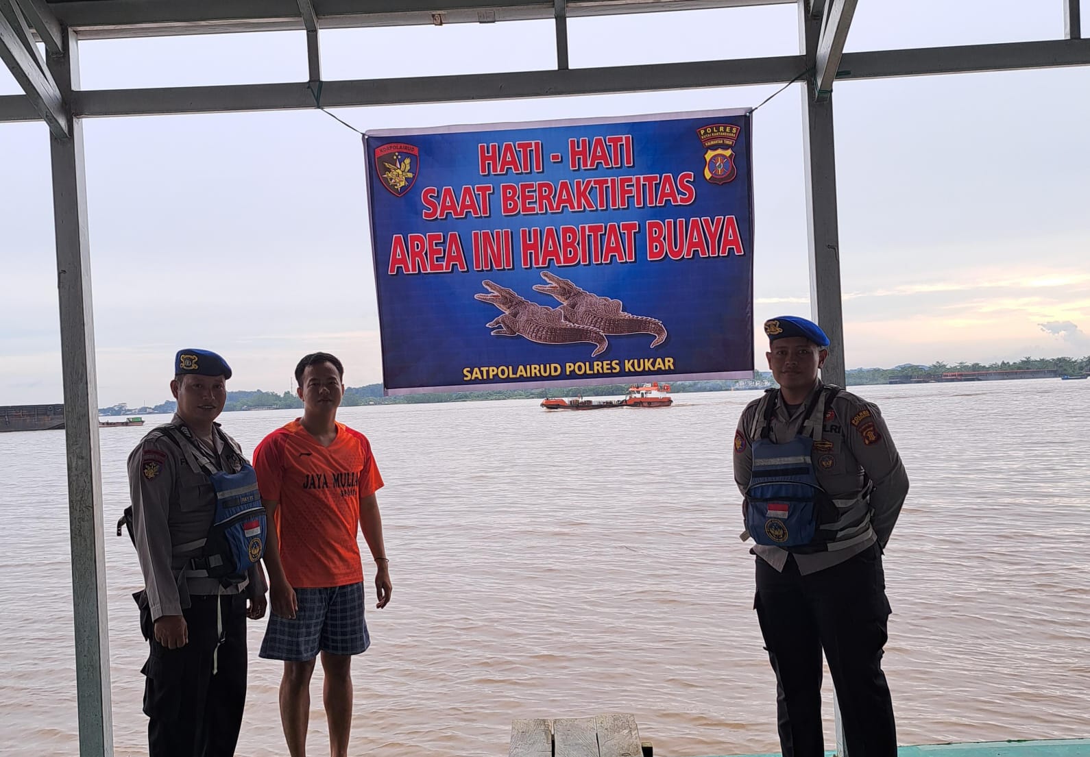 Spanduk berisi peringatan bertuliskan “HATI-HATI SAAT BERAKTIVITAS, AREA INI HABITAT BUAYA” dipasang oleh personel Sat Polairud, Bripka Feky F dan Bripda Dwika, sebagai bentuk edukasi langsung kepada warga, terutama terkait bahaya kecelakaan air dan potensi serangan buaya di kawasan tersebut.