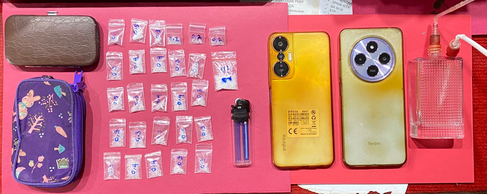 “Tim Unit Reskrim segera melakukan penyelidikan dan penggerebekan setelah memastikan keberadaan target. Dari hasil penggeledahan, kami menemukan 27 bungkus serbuk kristal diduga sabu dengan berbagai ukuran, mulai 0,2 hingga 1,3 gram,” ungkap AKP Elnath.