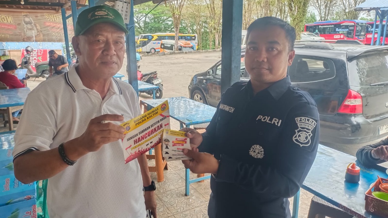 Dua personel dari Subbid Penmas Bidhumas Polda Kaltim, yaitu Aipda Gantang T.H.S.A.P dan Bripda Elangga Mahardinanta, terjun langsung ke lapangan untuk menyampaikan pesan-pesan kamtibmas secara langsung kepada masyarakat melalui media spanduk dan stiker.