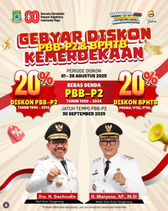 SIDIKPOST | Kota Tangerang, Dalam rangka menyambut Hari Ulang Tahun ke-80 Republik Indonesia, Pemerintah Kota Tangerang melalui Badan Pendapatan Daerah (Bapenda) kembali meluncurkan program diskon pajak edisi Kemerdekaan yang berlaku mulai 1 hingga 29 Agustus 2025. Program ini ditujukan untuk memberikan kemudahan kepada masyarakat sekaligus meningkatkan pendapatan asli daerah secara berkelanjutan.