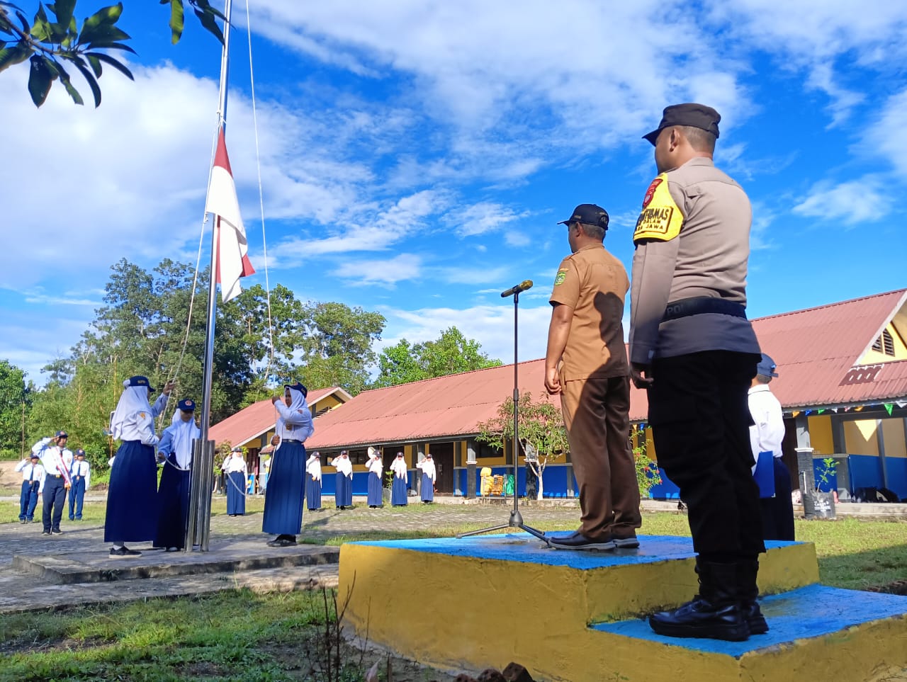 SIDIKPOST| Kukar – Bhabinkamtibmas Kelurahan Teluk Dalam Polsek Muara Jawa, Aipda I Gede Wiadnyana, memimpin upacara bendera di SMP Negeri 04 Muara Jawa, Jalan Abdul Rasyid RT 006, Senin (11/8/2025).