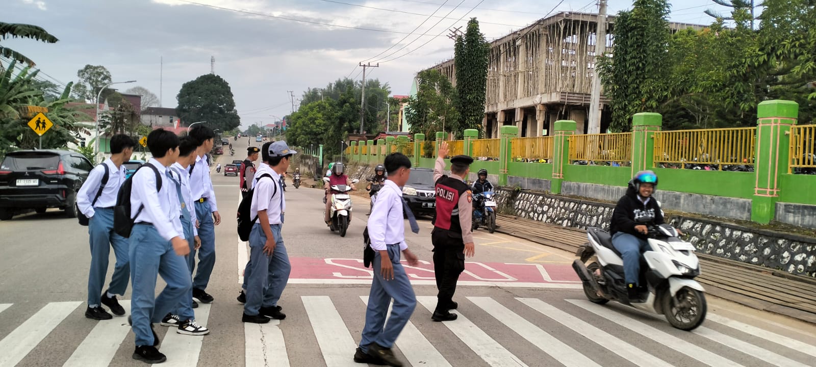 Beberapa lokasi seperti depan sekolah, area pasar, hingga persimpangan utama menjadi fokus pengaturan. Anggota kepolisian tampak aktif membantu kelancaran arus kendaraan sekaligus menyeberangkan pelajar dan warga yang beraktivitas.