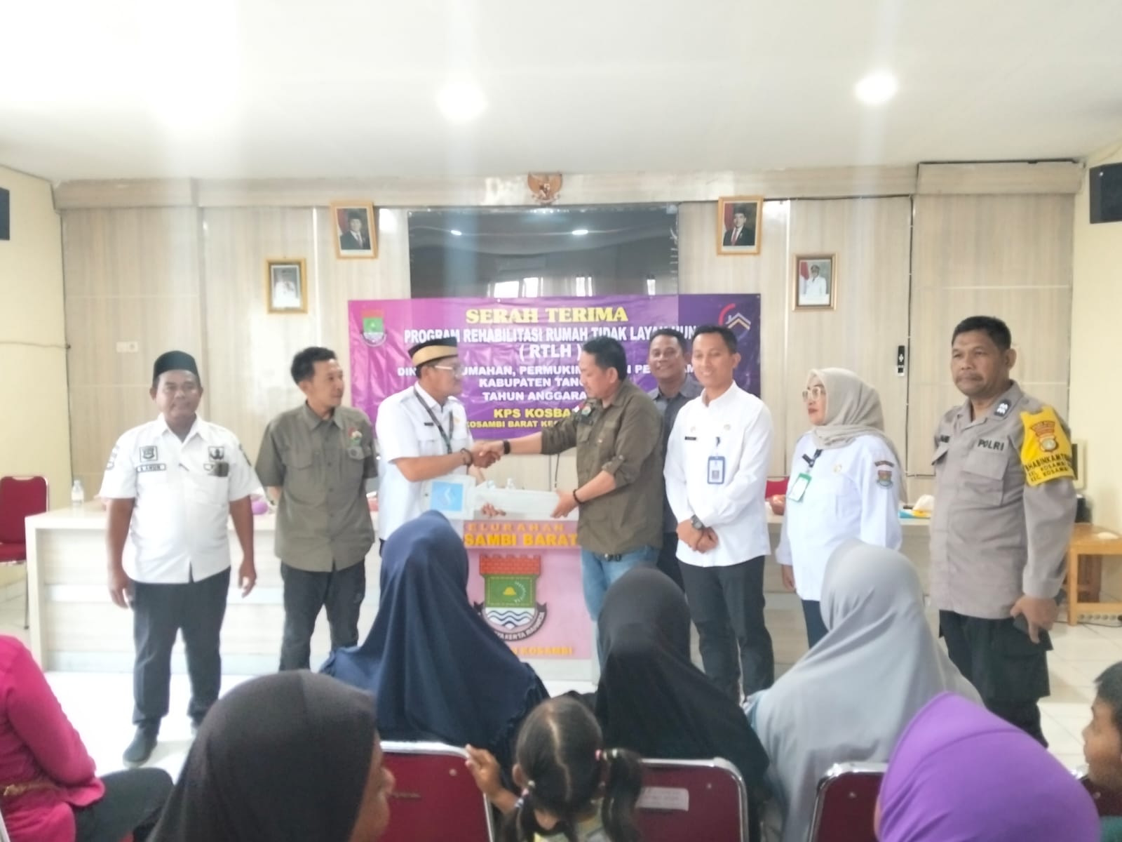 Acara Serah Terima Program Rehabilitasi Rumah Tidak Layak Huni (RTLH) Dinas Perumahan Permukiman Dan Pemakaman Kabupaten Tangerang Di Aula Kantor Kelurahan Kosambi Barat Dihadiri Oleh M. Yusuf S. IP. M. Si Sekcam Kosambi Beserta Sidatul Uyun S. IP Sekel Kosambi Barat Bersama Minto H. Misan Pelor Ketua Koordinator RTLH Kecamatan Kosambi Beserta Asep Jauhari Dari Dinas Perumahan Permukiman Dan Pemakaman Kabupaten Tangerang Beserta M. Anun Ketua KPS Kelompok Pelaksana Swakelola Kosbar Jaya Bersama Warga Penerima Kelurahan Kosambi Barat Bersama Aiptu Rahmat S Bhabinkamtibmas Kelurahan Kosambi Barat (Polsek Teluknaga).