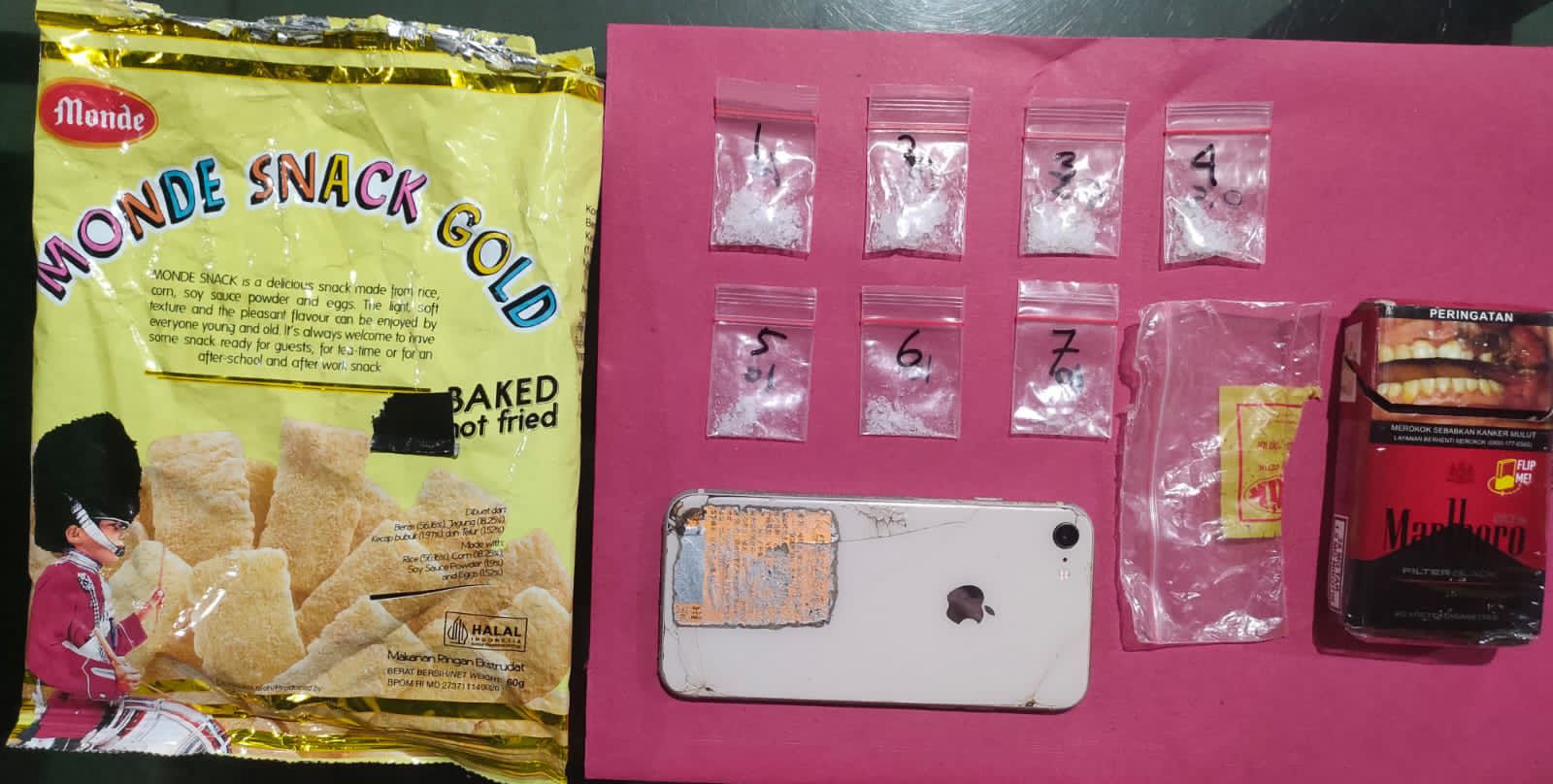 Hasil pemeriksaan terhadap bungkusan yang dibuang menunjukkan adanya tujuh poket sabu dengan berat sekitar 4,04 gram. Barang haram itu disembunyikan dalam kemasan makanan ringan untuk mengelabui petugas. Selain sabu, polisi turut menyita ponsel, dompet, kotak rokok, dan plastik klip sebagai barang bukti tambahan.
