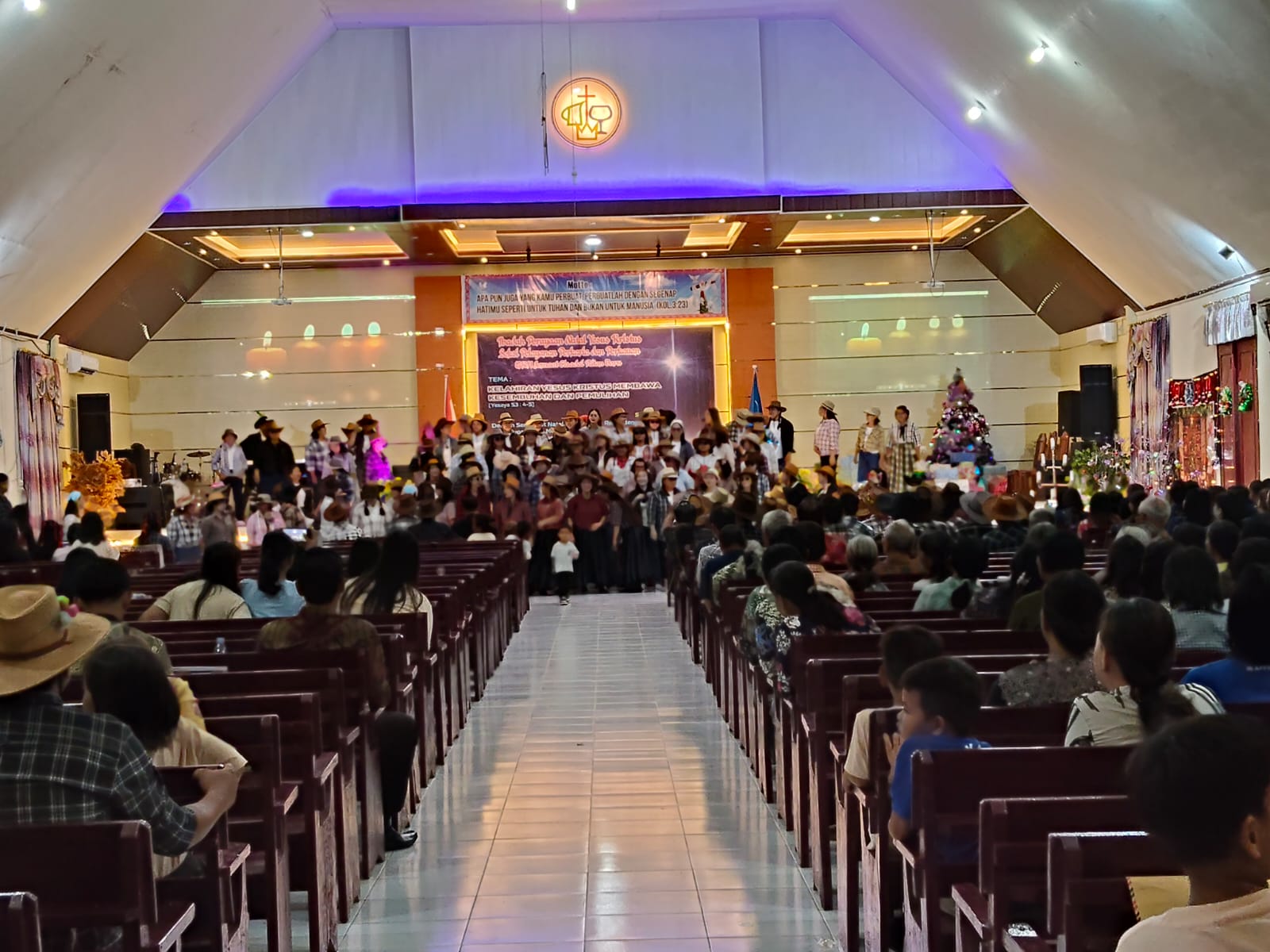 Ibadah Natal dimulai sekitar pukul 20.00 WITA dan diikuti kurang lebih 300 jemaat. Seluruh rangkaian ibadah berlangsung dengan khidmat, penuh sukacita, dan tertib. Kegiatan dipimpin oleh Pdt. Marison Sia, M.Th dan Pdt. Musa Levin, M.Th dengan mengusung tema “Kelahiran Yesus Kristus Membawa Kesembuhan dan Pemulihan.”