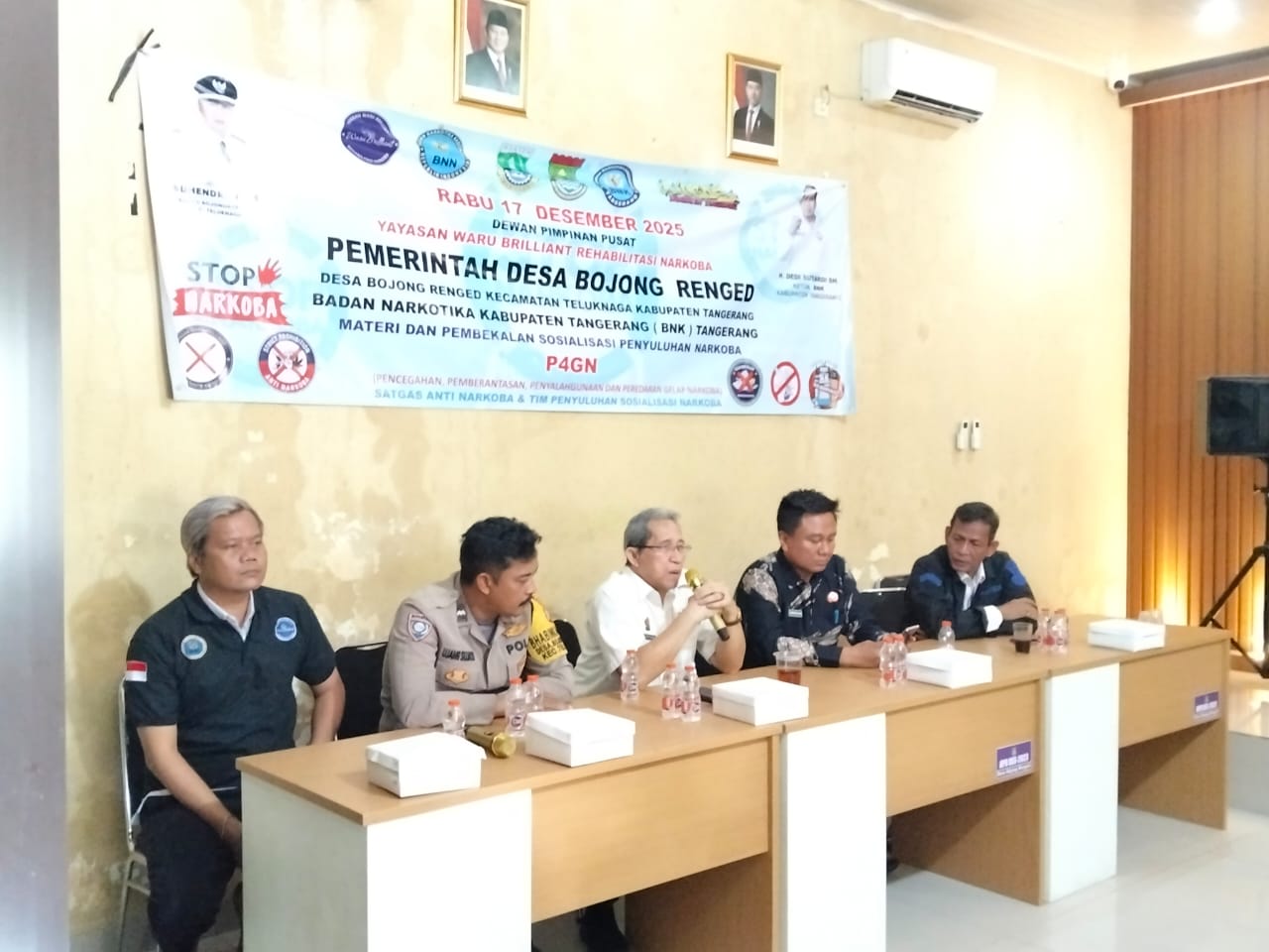 SIDIKPOST| Kabupaten Tangerang – Pemerintah Desa Bojong Renged Bersama Yayasan Waru Brilliant Rehabilitasi Desa Bojong Renged Beserta BNK Badan Narkotika Kabupaten Tangerang Menggelar Kegiatan Acara Materi Dan Pembekalan Sosialisasi Penyuluhan Narkoba Tahun 2025. Acara Tersebut Dihadiri Langsung Oleh H. Dedi Sutardi SH Ketua BNK Badan Narkotika Kabupaten Tangerang Bersama Ferry Zulfian S.H.,M.H Sekcam Teluknaga Didampingi Oleh Suhendra HMS Kepala Desa Bojong Renged Beserta Mahfud Eki Sawira Sekdes Bojong Renged Beserta Aiptu Ujang Bhabinkamtibmas Desa Bojong Renged (Polsek Teluknaga). Acara Tersebut Dilaksanakan Di Kantor Desa Bojong Renged Kecamatan Teluknaga Kabupaten Tangerang.(17/12/25)