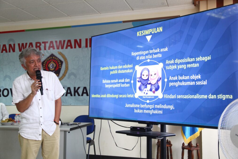Sementara itu, Bagus Sudarmanto, Wakil Ketua Bidang Organisasi PWI Jaya, memaparkan materi pemberitaan ramah anak, khususnya terkait perlindungan identitas anak, penggunaan bahasa yang empatik, serta pentingnya menjadikan kepentingan terbaik anak sebagai prinsip utama dalam peliputan.