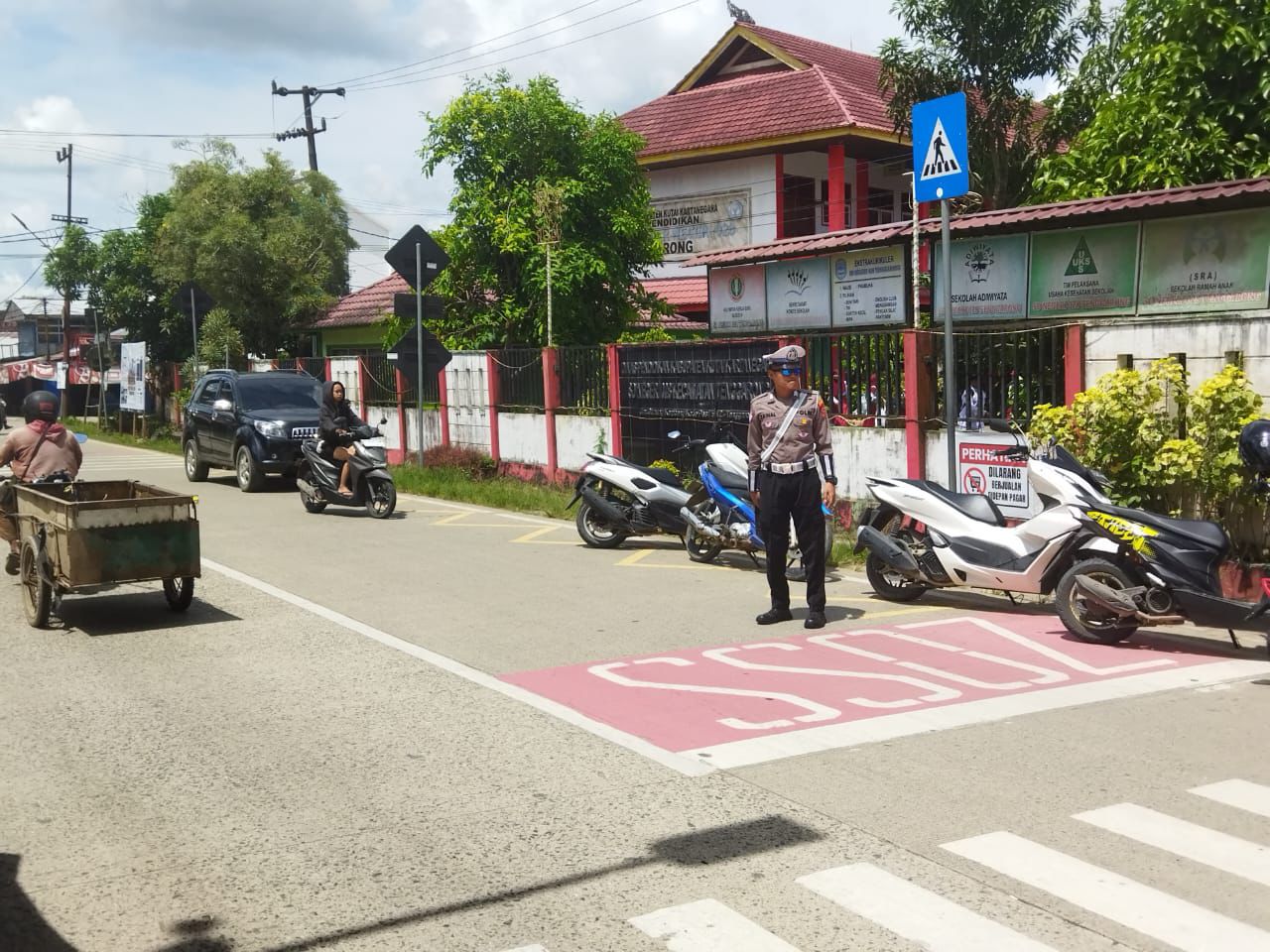 “Personel membantu siswa menyeberang jalan, mengatur kendaraan penjemput agar tidak mengganggu arus lalu lintas, serta memberikan imbauan secara humanis kepada pengendara yang tidak menggunakan helm,” ujar AKP Ahmad Fandoli.