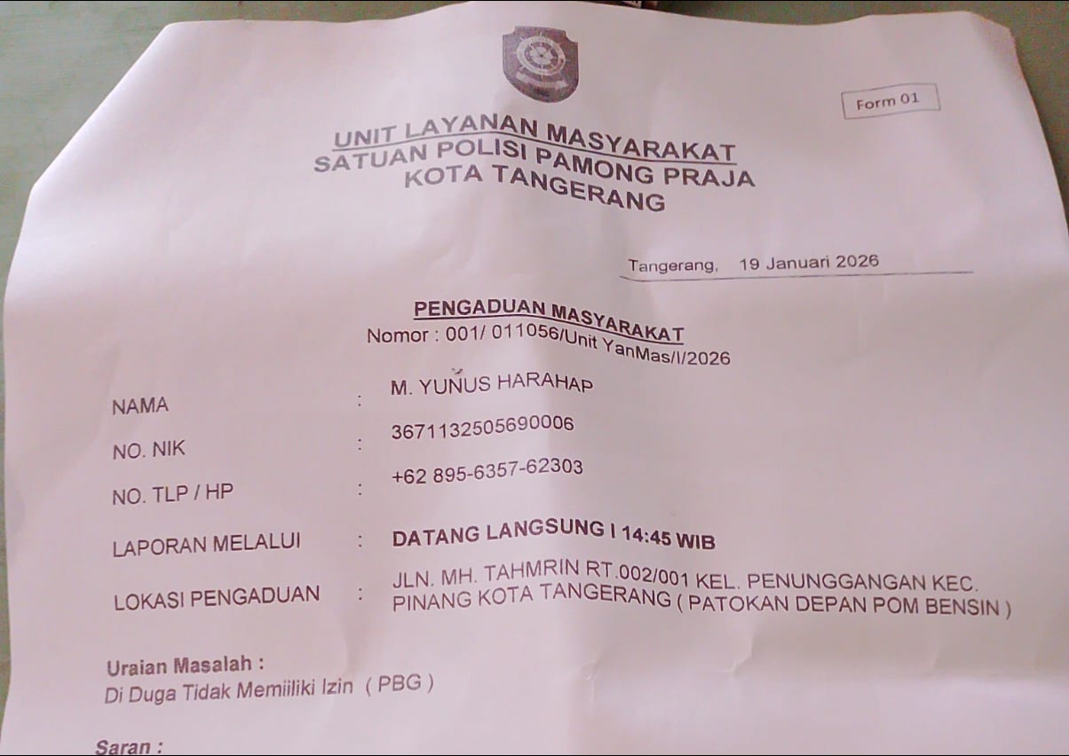Laporan disampaikan langsung oleh warga kepada Unit Layanan Masyarakat Satpol PP Kota Tangerang pada Senin, 19 Januari 2026. Dalam laporan tersebut, warga menyebutkan bahwa pembangunan telah berlangsung cukup lama, namun tidak ditemukan papan informasi proyek maupun dokumen perizinan yang terpasang di lokasi bangunan.