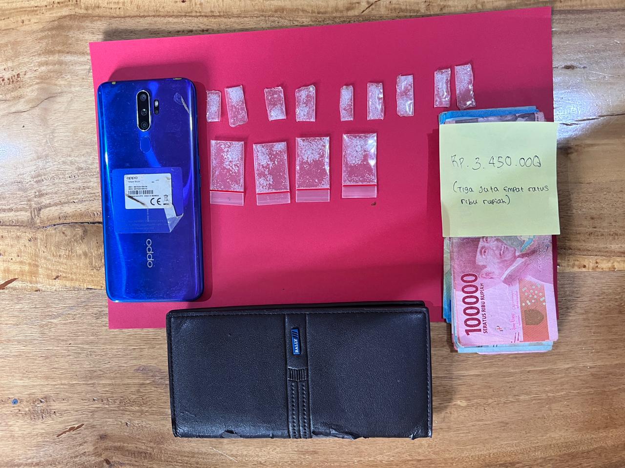 Saat dilakukan penggeledahan, petugas menemukan 13 bungkus plastik bening berisi kristal putih yang diduga kuat narkotika jenis sabu dengan berat kotor 2,22 gram. Barang haram tersebut ditemukan tersimpan di dalam kantong celana tersangka. Selain itu, turut diamankan satu dompet warna hitam, satu unit handphone merek OPPO warna biru, uang tunai sebesar Rp3.450.000 yang diduga hasil penjualan, serta satu celana pendek kargo warna abu-abu.