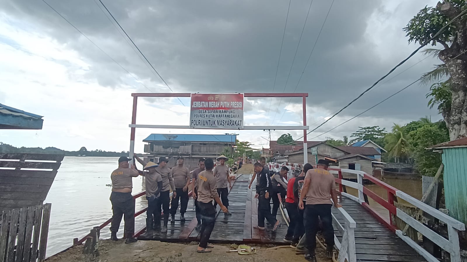 Peresmian jembatan yang menjadi jalur vital bagi warga ini ditandai dengan pemotongan pita oleh Kapolres, didampingi oleh Wakapolres Kompol Izdiharuddin Faris Raharja Putra, jajaran Pejabat Utama (PJU) Polres Kukar, serta unsur Pemerintah Desa dan tokoh masyarakat setempat.