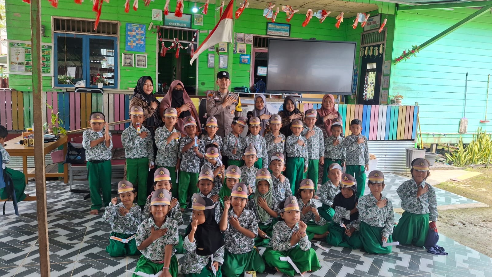 Kehadiran Bhabinkamtibmas Desa Jembayan Tengah, Aipda Erwin Efendi, di tengah-tengah halaman sekolah disambut hangat oleh sekitar 40 murid beserta para guru. Alih-alih merasa takut, anak-anak justru berebut menyalami petugas yang datang dengan pendekatan humanis tersebut.