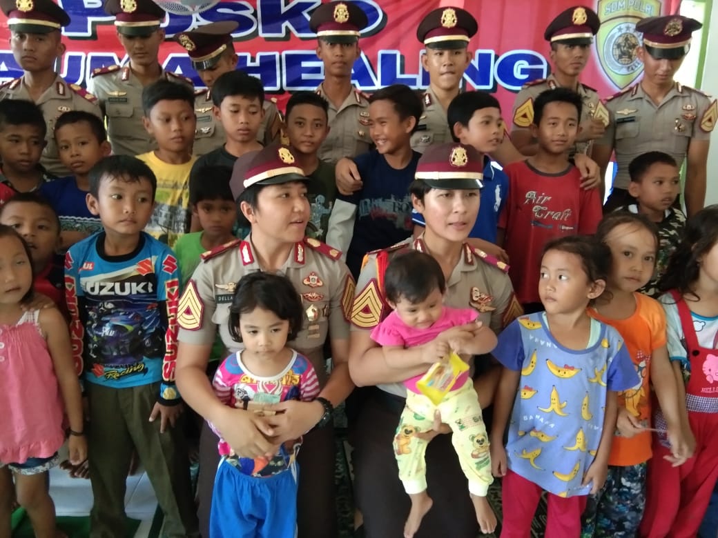 16 personil Akedemi Polisi Laksanakan Trauma healing di tenda pengungsian Desa Curug lampung selatan,29 Desember 2019.