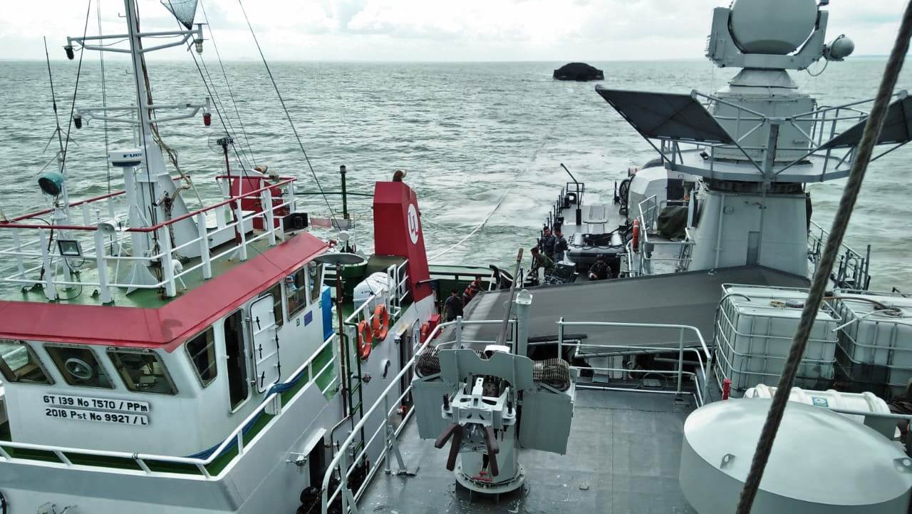 Jakarta, 1 Januari 2019,– Keberadaan Unsur KRI Jajaran Koarmada I dalam memberantas kegiatan ilegal dan menegakkan hukum di laut terus membuahkan hasil. Kali ini KRI Cut Nyak Dien-375 berhasil menangkap Tug Boat yang menggandeng Tongkang muatan pasir yang melebihi kapasitas muatan dan tidak memiliki jangkar serta AIS sehingga diduga melanggar UU Pelayaran di Perairan Selat Berhala, Sabtu (30/12).