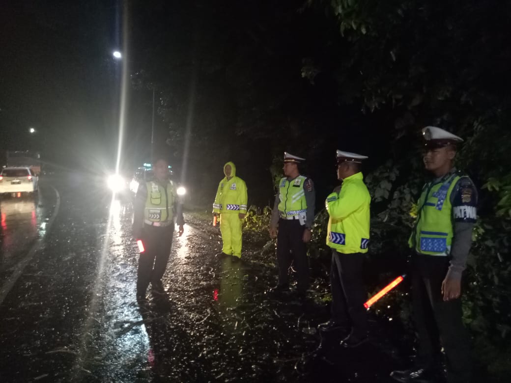 Satuan lalulintas polres lampung Selatan yang awaki oleh Bripka Syahril bersama tim membersihkan pohon tumbang yang melintang dan menutupi akses jalan raya di Jalinsum desa Merak Belantung Kec.kalianda ,Jum,at (11/1/2019). Sekira pukul 19.15 wib.