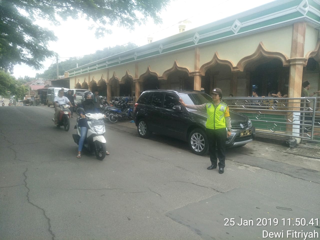 SIDIKPOST.COM| Lampung-Bhabinkamtibmas Kelapa Tiga Permai Polsek TKB Balam Aipda Dewi Fitriyah melakukan pengamanan dan pengaturan kegiatan ibadah sholat Jumat di Masjid Jami Nurul Khoir Kelurahan Sukajawa, Jumat (25/1/2019).