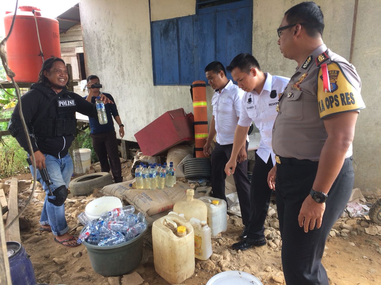 Dari TKP yang berada di lereng bukit itu, polisi juga menyita sejumlah barang bukti lainnya, berupa 2 buah jerigen 20 liter, 12 buah jerigen 30 liter, ember bekas cat tembok 20 kilogram sebanyak 4 buah, drum plastik ukuran 200 liter 1 buah dan botol air minum kemasan sebanyah 49 buah. Ditambah corong untuk mengisi botol 1 buah, ember bekas cat berkeran untuk pengemasan 1 buah, galon plastik ukuran 30 liter dengan keran.