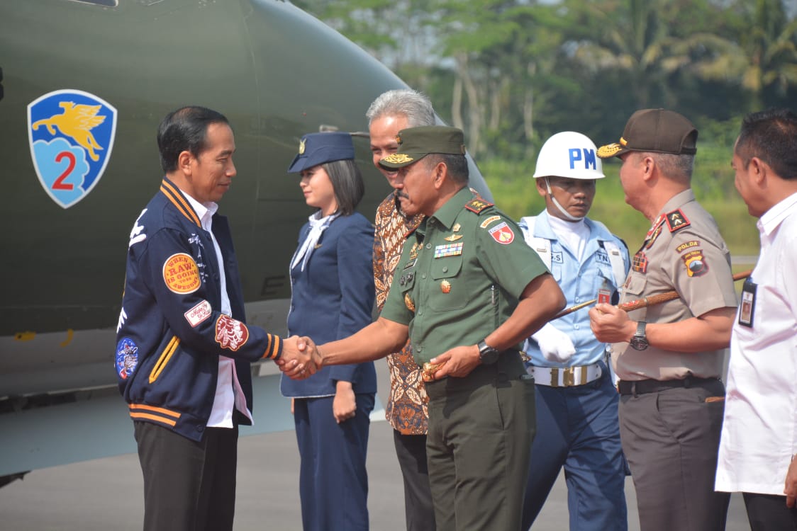 SIDIKPOST| Cilacap – Pangdam IV/Diponegoro Mayjen TNI Muhammad Efendi bersama Kapolda Jateng Irjen Pol Condro Kirono M.M., M. Hum., Gubernur Jawa Tengah Ganjar Pranowo dan Bupati Cilacap Tato. S menyambut kedatangan Presiden RI Ir. H. Joko Widodo di Bandara Tunggul Wulung Cilacap, Senin (25/2/2019).