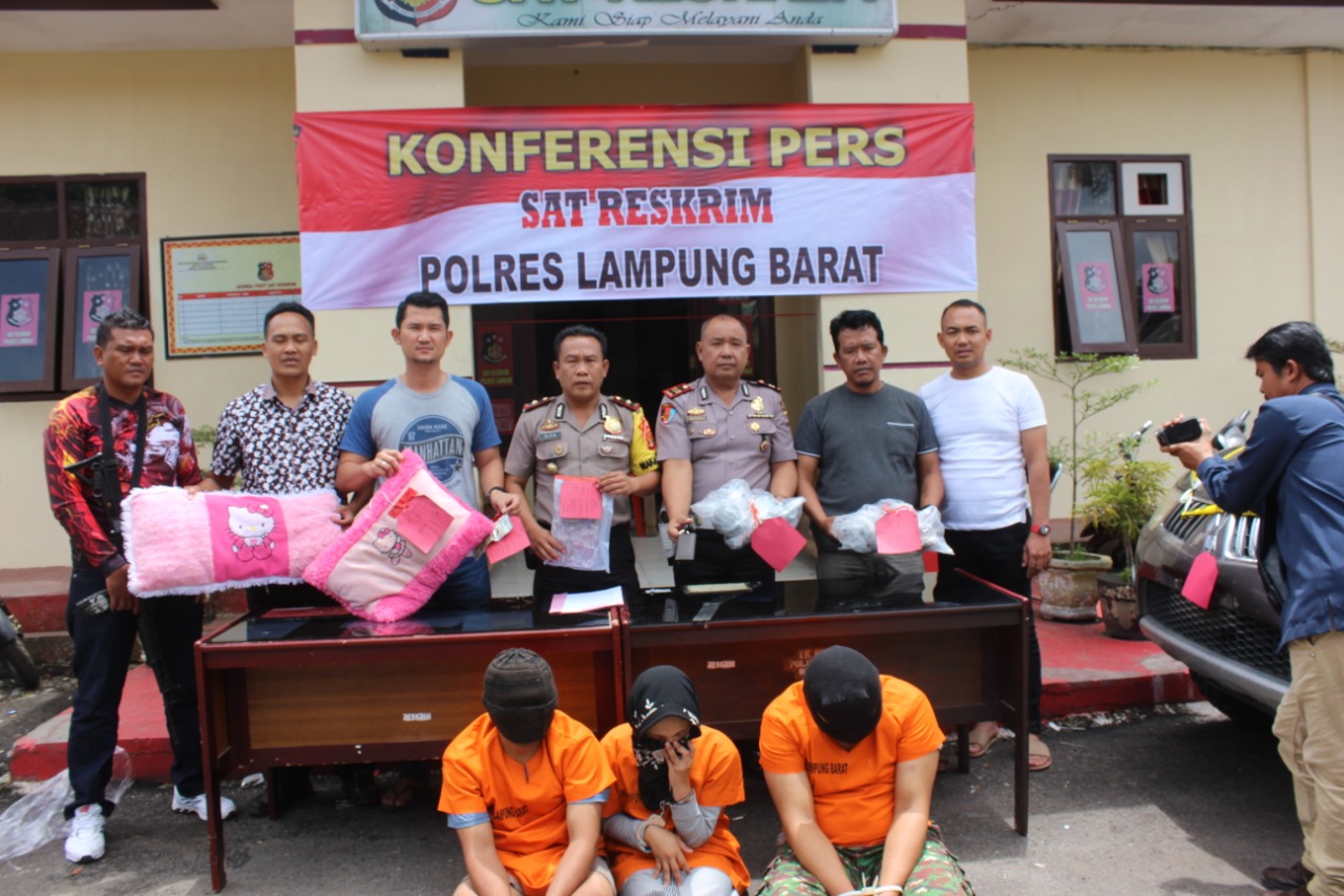 Waka Polres Lampung Barat Kompol M. Riza,Sh.MH. mewakili Kapolres Lampung Barat AKBP Doni Wahyudi,S.Ik. bersama Kasat Reskrim Polres Lampung Barat AKP Faria Arista,S.Ik.S.Kom. saat menggelar Konferensi Pers menerangkan. pelaku berjumlah empat orang melibatkan satu wanita yang merupakan keponakan korban.