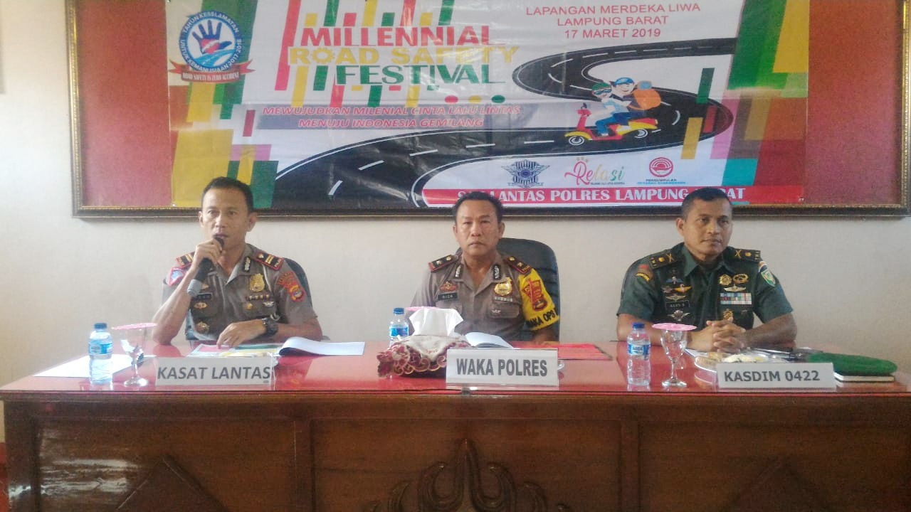 Lampung- Dalam rangka untuk mensukseskan kegiatan Millennial Road Safety Festival yang akan di gelar pada minggu 17 Maret 2019 Polres Lampung Barat dan jajarannya berikut TNI dan dinas terkait menggelar Rapat Koordinasi di aula Partisarawirya pada Jumat 15/03/2019.