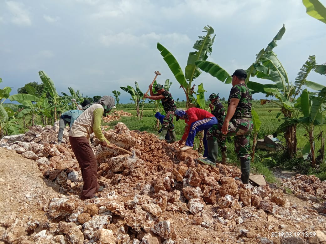 SIDIKPOST| Tuban — Beberapa anggota satgas TMMD REG 104 Kodim 0811 terlihat memecah batu dengan cara di pukul dengan palu, Rabu (20/03/2019).
