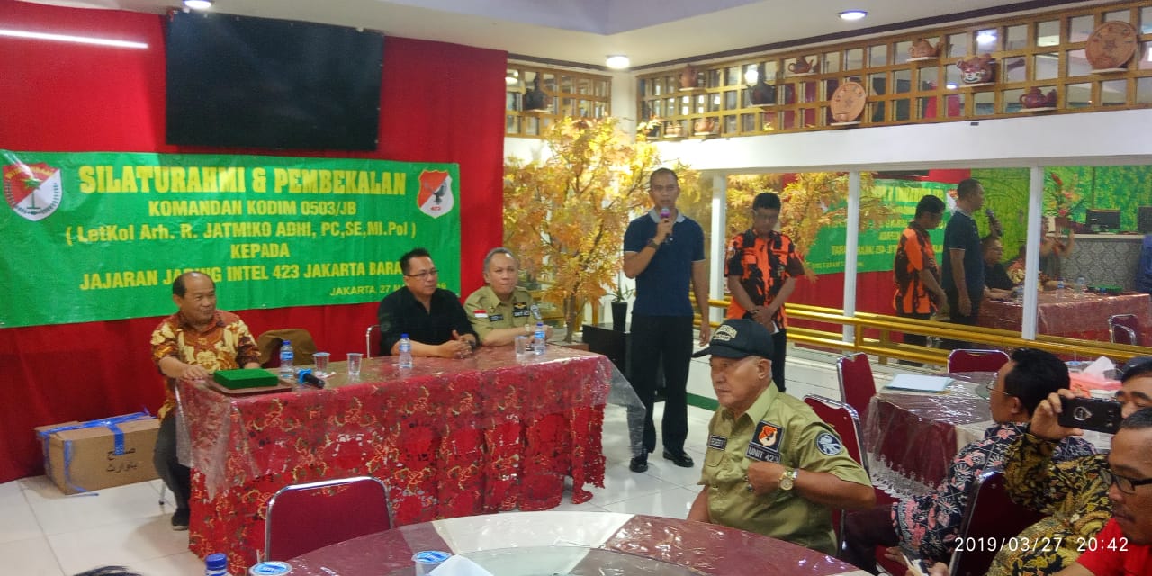SIDIKPOST| JAKARTA BARAT – Komandan Distrik Militer (Dandim) 0503/Jakarta Barat Korem 052/Wijayakrama Letkol Arh. R. Jatmiko Adhi, P.C, SE, M.I.Pol membekali Ketua dan anggota Jaring Intel 423 Jakarta Barat dengan arahan dan himbauan dalam rangka tatap muka, membangun komunikasi dan menjalin silaturahmi di Taman Duta Mas Sport Center, Komplek Taman Duta Mas, Blok F9 No. 1-3 RT009/RW05, Kelurahan Wijaya Kusuma, Kecamatan Grogol Petamburan, Kota Jakarta Barat, Rabu (27/03/2019) Malam.
