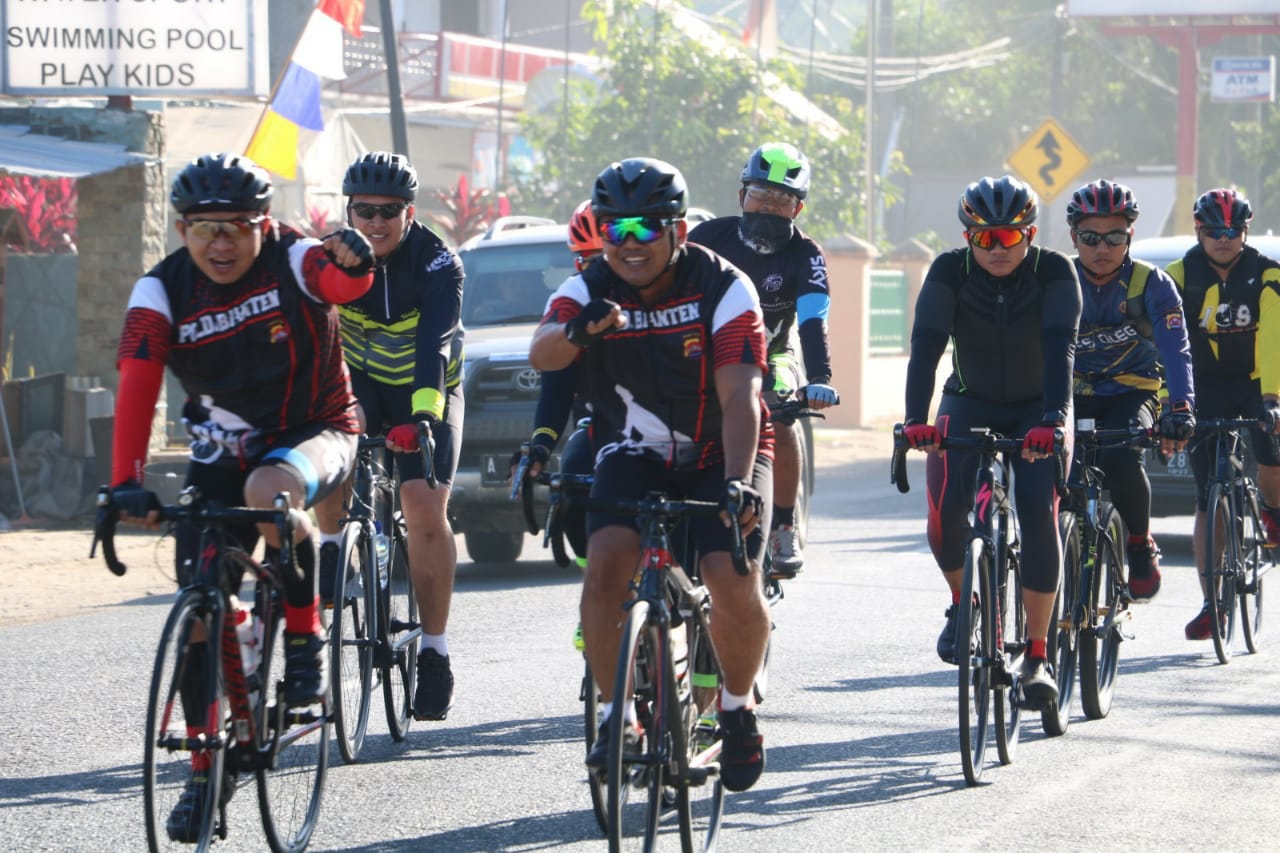 Guna meningkatkan silaturahmi antara pimpinan dengan staf dan menjaga stamina serta mensosialisasikan pariwisata Anyer aman untuk di kunjungi, Kepolisian Daerah (Polda) Banten bersama Polres Cilegon menggelar Gowes Gembira. Rabu (3/4/2019).