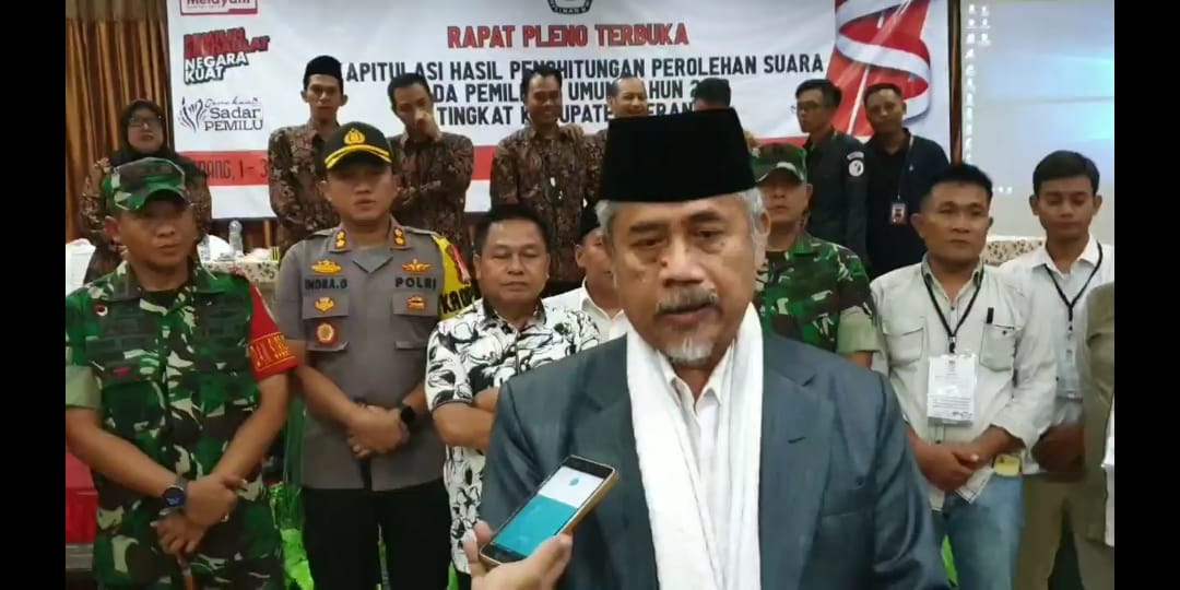 “Saya ucapkan terima kasih kepada seluruh pihak yang terlibat dalam Pemilu 2019. Saya menyatakan hasil pemilu berjalan lancar, aman, sangat transparan, jujur, adil dan dilakukan secara demokratis,” kata Rahmat Fatoni saat menghadiri rapat pleno terbuka rekapitulasi hasil penghitungan suara tingkat kabupaten di Kota Serang, Jumat (3/5/2019).