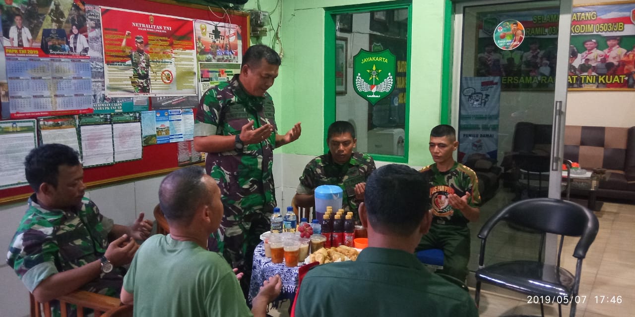 SIDIKPOST| JAKARTA BARAT – Dalam rangka mempererat kekeluargaan dan kebersamaan Satuan Koramil 03/GP Kodim 0503/JB di bulan Ramadhan 1440 Hijriah, Danramil 03/GP Kapten Inf Jefriansen Sipayung, SE menggelar buka puasa bersama (bukber) dengan para Anggotanya dan warga masyarakat sekitar di Makoramil 03/GP, Jalan Anggrek Garuda V No.7 RT.005/RW.02 Kelurahan Kemanggisan, Kecamatan Palmerah, Jakarta Barat, Selasa (7/5/2019).