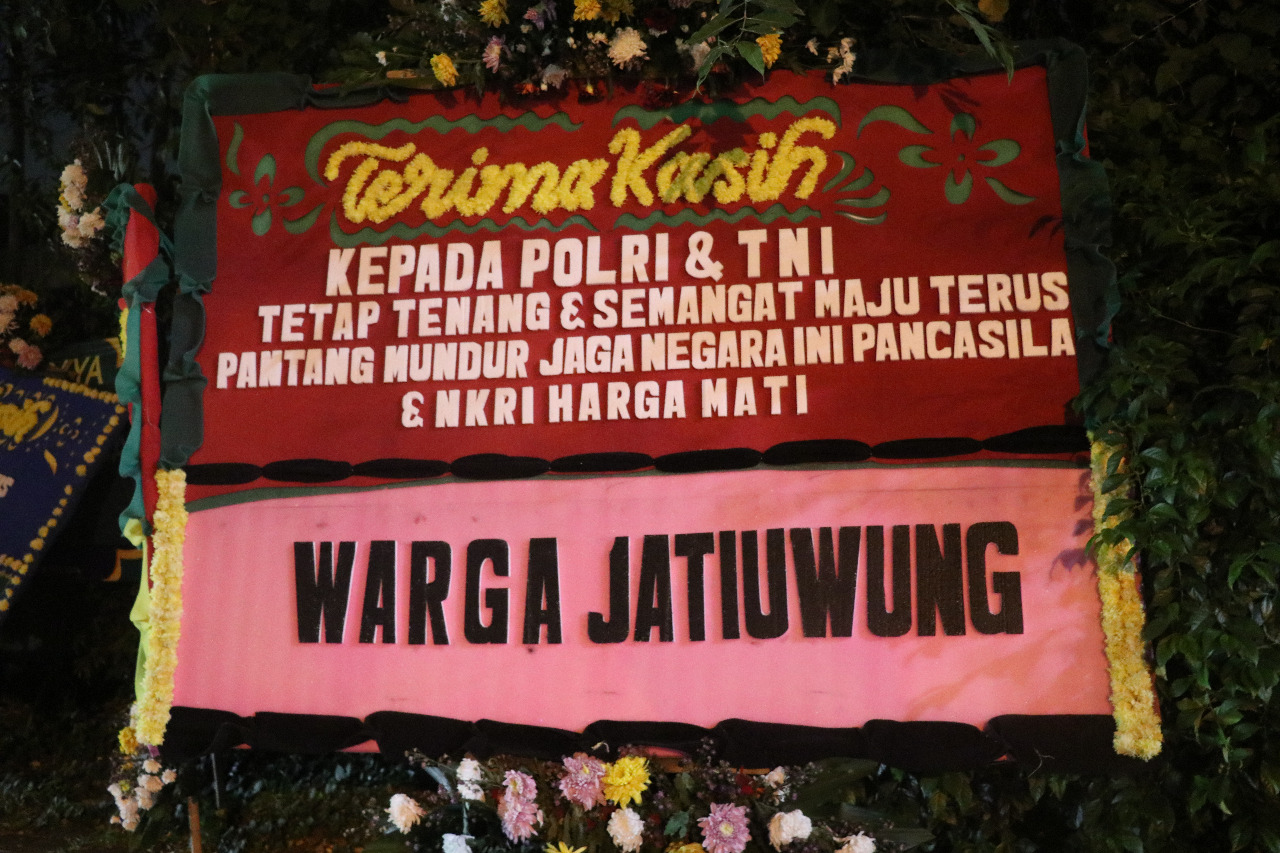 Salah satu karangan bunga yang admin pantau, tertulis dari Ibu-ibu Warga Pasar Baru yang mengucapkan terimakasih untuk TNI-Polri yang menjaga perdamaian NKRI. ( Red).