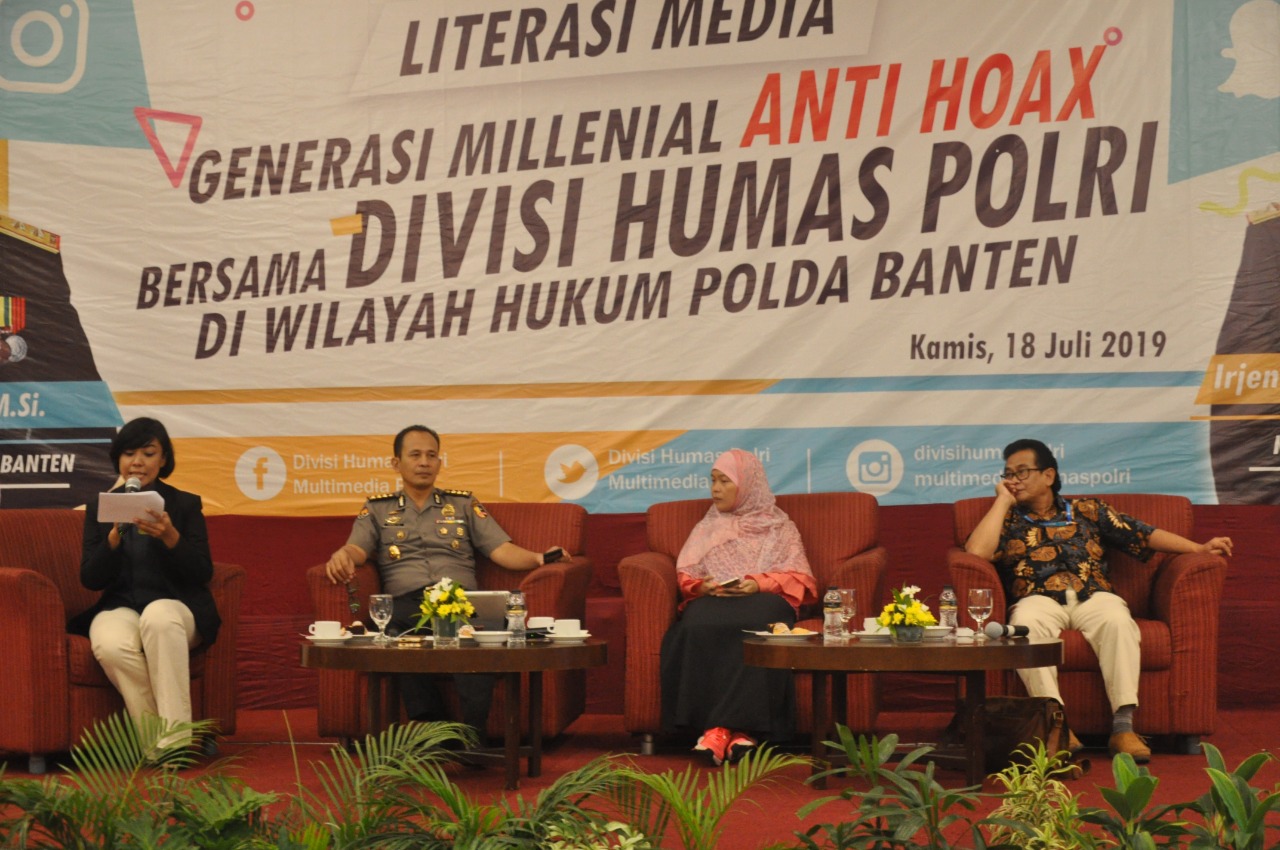 SIDUKPOST| CILEGON, – Dalam rangka penguatan tim media sosial dan media online, Kepolisian Daerah (Polda) Banten Bersama Divisi Humas Polri menggelar literasi media generasi millenial anti hoax bersama para pelajar, mahasiswa para guru, serta sejumlah perwakilan masyarakat, dan para jurnalis media online, di Ballroom Hotel The Royale Krakatau, Kota Cilegon, Kamis (18/7).