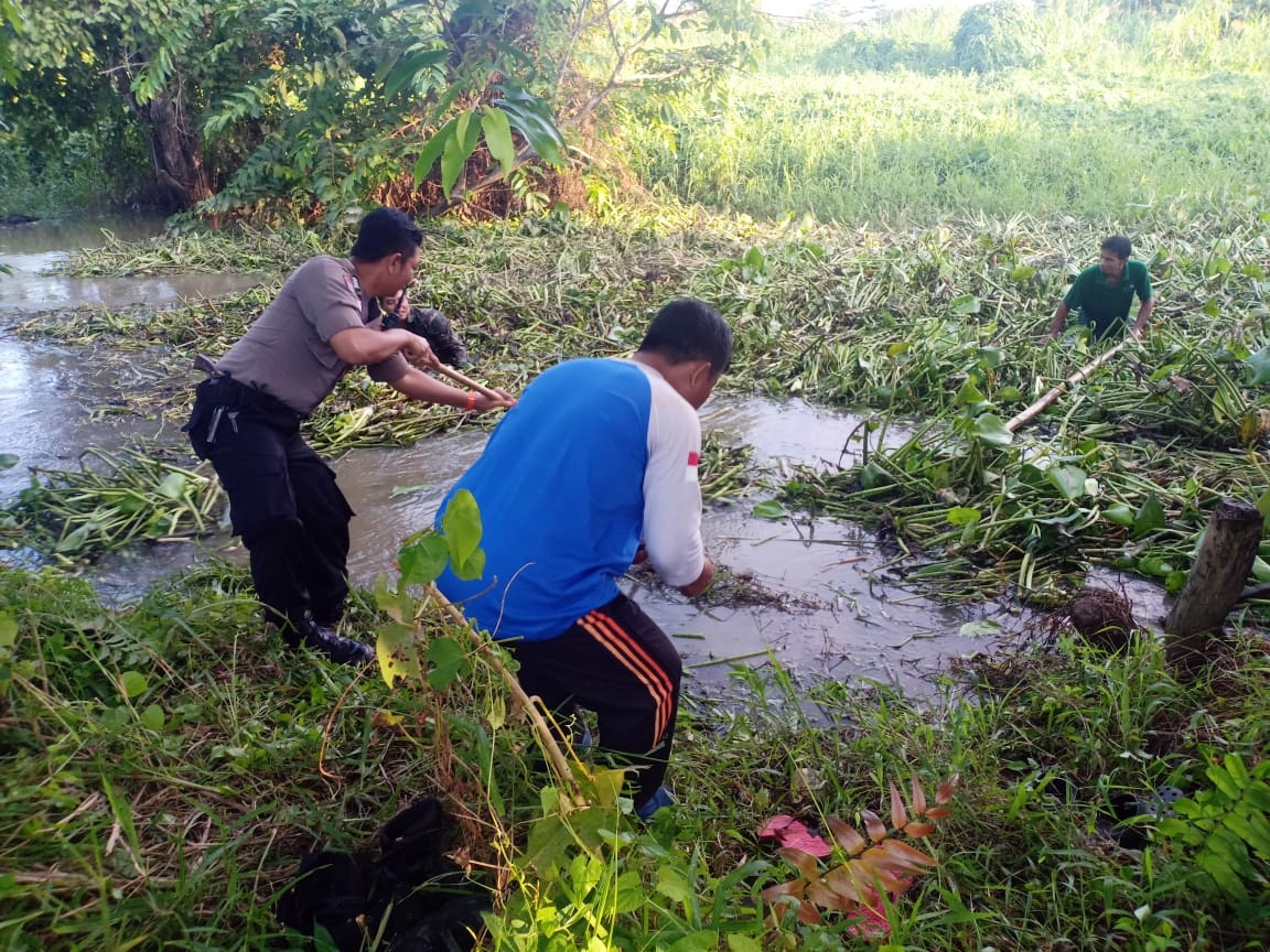 Antisipasi Banjir, Warga Bersama Bhabinkamtibmas Polsek Tenggarong Seberang Bersikan Eceng Gondok