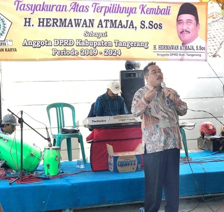 H Hermawan Atmaja.S.Sos.,Anggota DPRD Kab.Tangerang Dapil 3 Fraksi Partai Golkar Pada Saat Sambutan Menyampaikan ,” Saya Mengucapkan Alhamdullilah Serta Mengucapkan Puji Dan Syukur Kepada Allah SWT Atas Terpilihnya Kembali Sebagai Anggota DPRD Kabupaten Tangerang. Dan Saya Mengucapkan Terimakasih Kepada Semua Para Tamu Undangan Yang Telah Hadir Di Acara Tasyakuran Atas Terpilihnya Kembali ( H Hermawan Atmaja,S.Sos.,Sebagai Anggota DPRD Kab.Tangerang Periode 2019 – 2024) “.