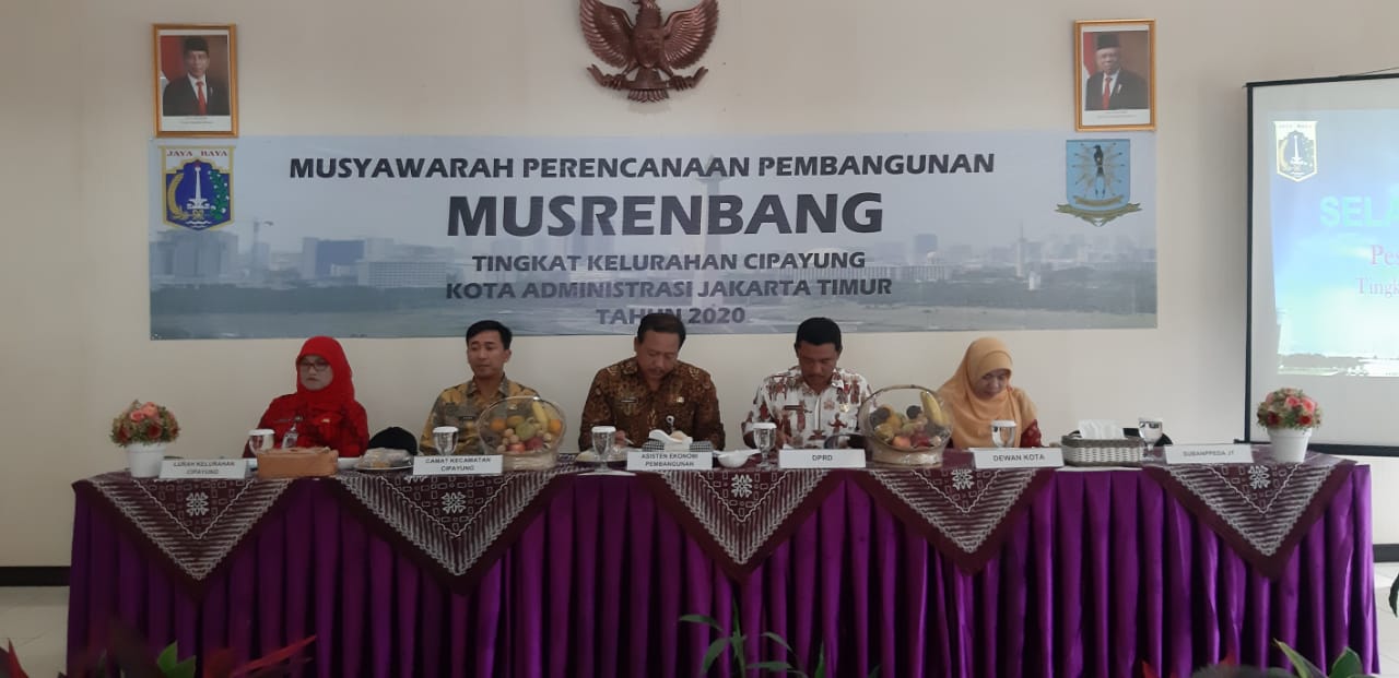 SIDIKPOST| Jakarta,- Pelaksanaan Musyawarah Perencanaan Pembangunan (Musrenbang) 2020 di Kelurahan Cipayung, Jakarta Timur, berlangsung di Aula pada Kantor Kelurahan, Kamis (13/2/2020). Musrenbang dibuka oleh Walikota Jakarta Timur yang di wakili oleh Asisten Ekonomi dan Pembangunan Adm. Kusmanto.