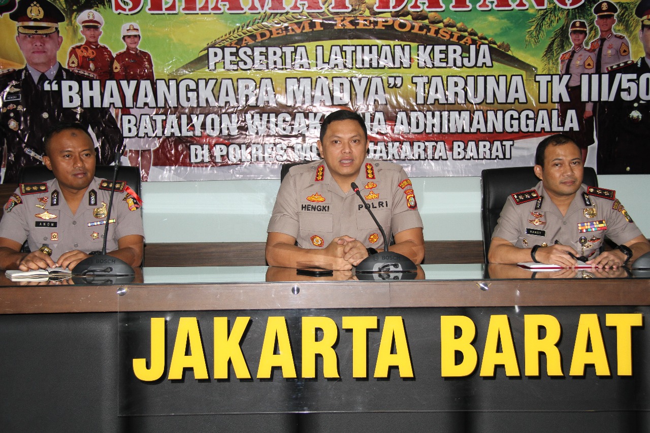 Kapolres Metro Jakarta Barat Kombes Pol Hengki Haryadi SIK MH menyambut kedatangan Akademi Taruna Akedemi Kepolisian (Akpol) Bhayangkara Madya di ruang rapat Aris Dinanta Polres Metro Jakarta Barat pada hari Senin (04/05). Kedatangan Akpol tersebut dalam rangka menggelar latihan kerja