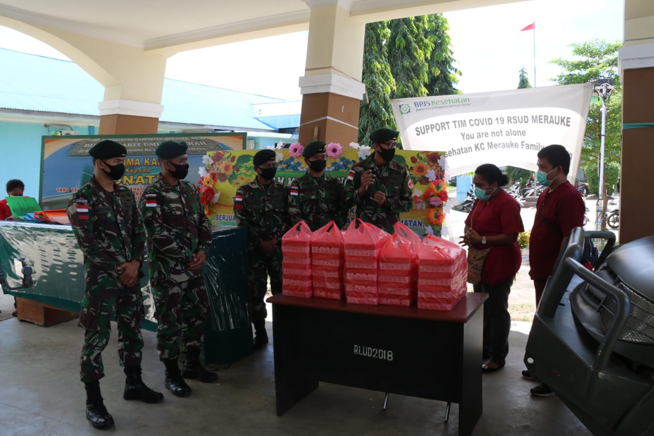 Dalam kegiatan kali ini, enam personel Yonif 411 Kostrad dipimpin Pasilog Satgas Lettu Inf Ferdi Agus Darmawan, membagikan makan siang kepada para tenaga medis di RSUD Merauke, yang merupakan rumah sakit rujukkan penanganan Covid-19 di wilayah Papua bagian selatan.