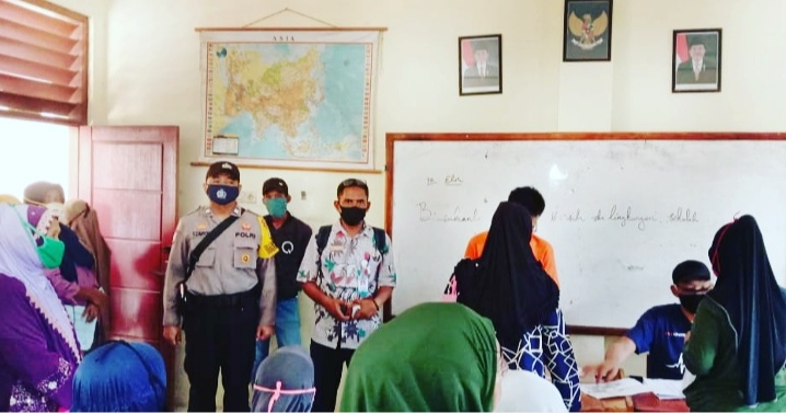 Aiptu Yudi C Bhabinkamtibmas Desa Tanjung Pasir (Polsek Teluknaga) ,Memberikan Himbauan Dan Mengingatkan Kepada Warga Masyarakat Desa Tanjung Pasir Agar Tetap Gunakan Masker, Cuci Tangan Dan Jaga Jarak Serta Hindari Berkerumun Pada Saat Mengantri Pembagian BLT (Bantuan Langsung Tunai) Kemensos Tahap II Tahun 2020 Di (SDN 2 Tanjung Pasir) Desa Tanjung Pasir Kecamatan Teluknaga.