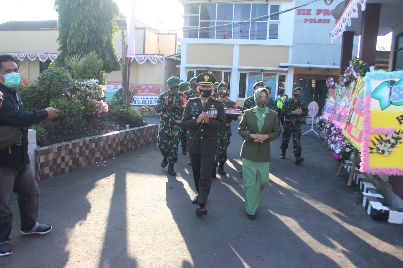 SIDIKPOST| Pati – HUT Bhayangkara ke-74 tahun 2020 di Polres Pati dirayakan secara sederhana berbeda dengan perayaan tahun lalu karena pandemi covid-19 sehingga tidak melibatkan banyak personel. Dalam kegiatan perayaan moment Ulang Tahun Coprs Bhayangkara hari ini Anggota Polres Pati dikejutkan oleh rombongan TNI dari Kodim 0718 Pati dipimpin langsung oleh Komandan Kodim 0718 Pati Letkol Czi Adi Ilham Zamani, SE, M.I.POL bersama Ketua Persit Cabang XXXIX Kodim Pati, perwakilan Danramil serta Perwira Staf Kodim Pati dengan membawa kue ulang tahun serta dengan pengeras suara menyanyikan lagu ulang tahun yang tiba-tiba masuk ke Markas Polres Pati. Rabu,01/07/2020.
